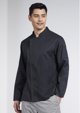 - Mandarin collar with apron tab to hold apron in place.