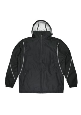 - Zip-up hooded jacket, waterproof zips at front and side pockets, adjustable elastic drawcords at hem and hood, rubber headphone patch, sealed seams, water resistant, SPF 40, packable